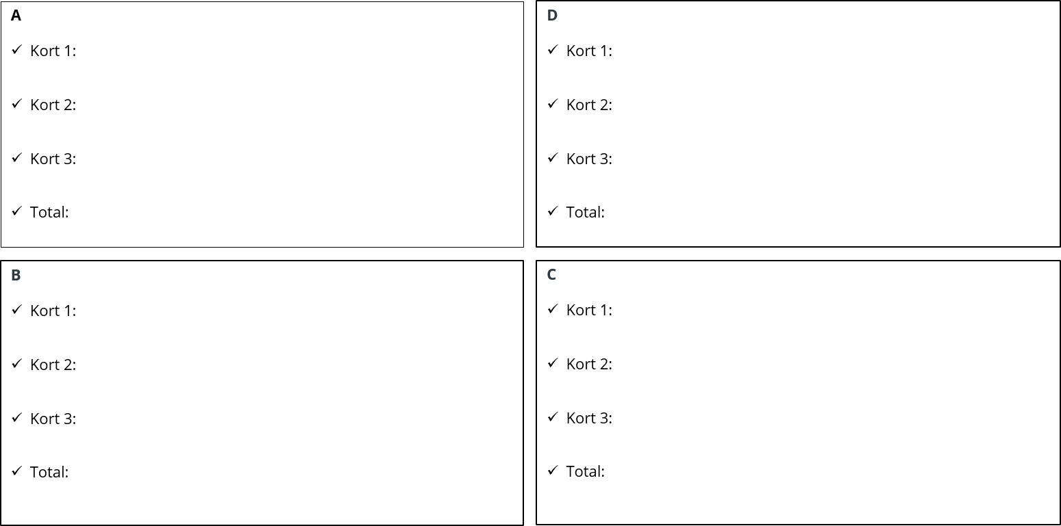 - Skriv det antal ord og sætninger, du har markeret på hvert kort, i hver af de fire kvadranter (A, B, C, D) i de respektive felter