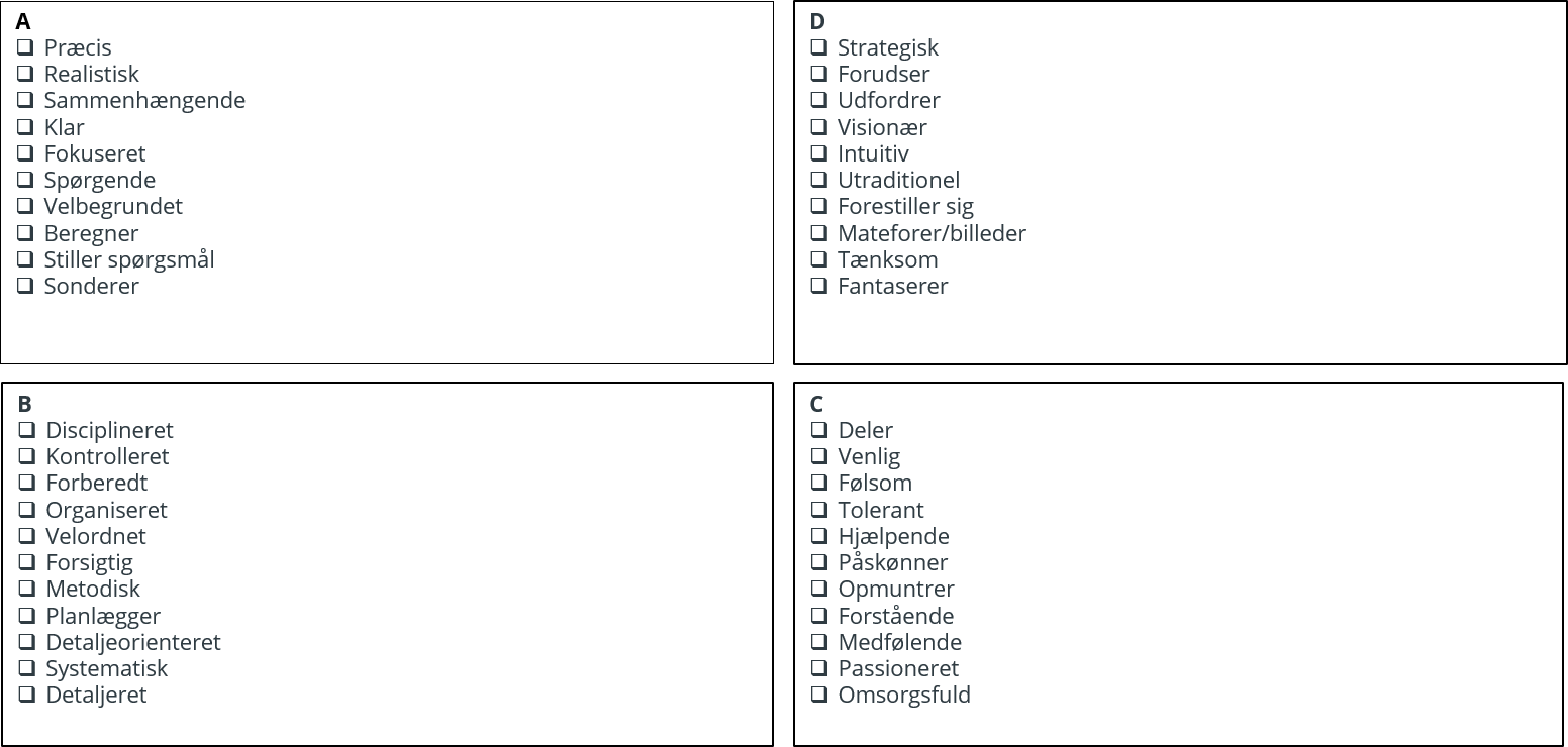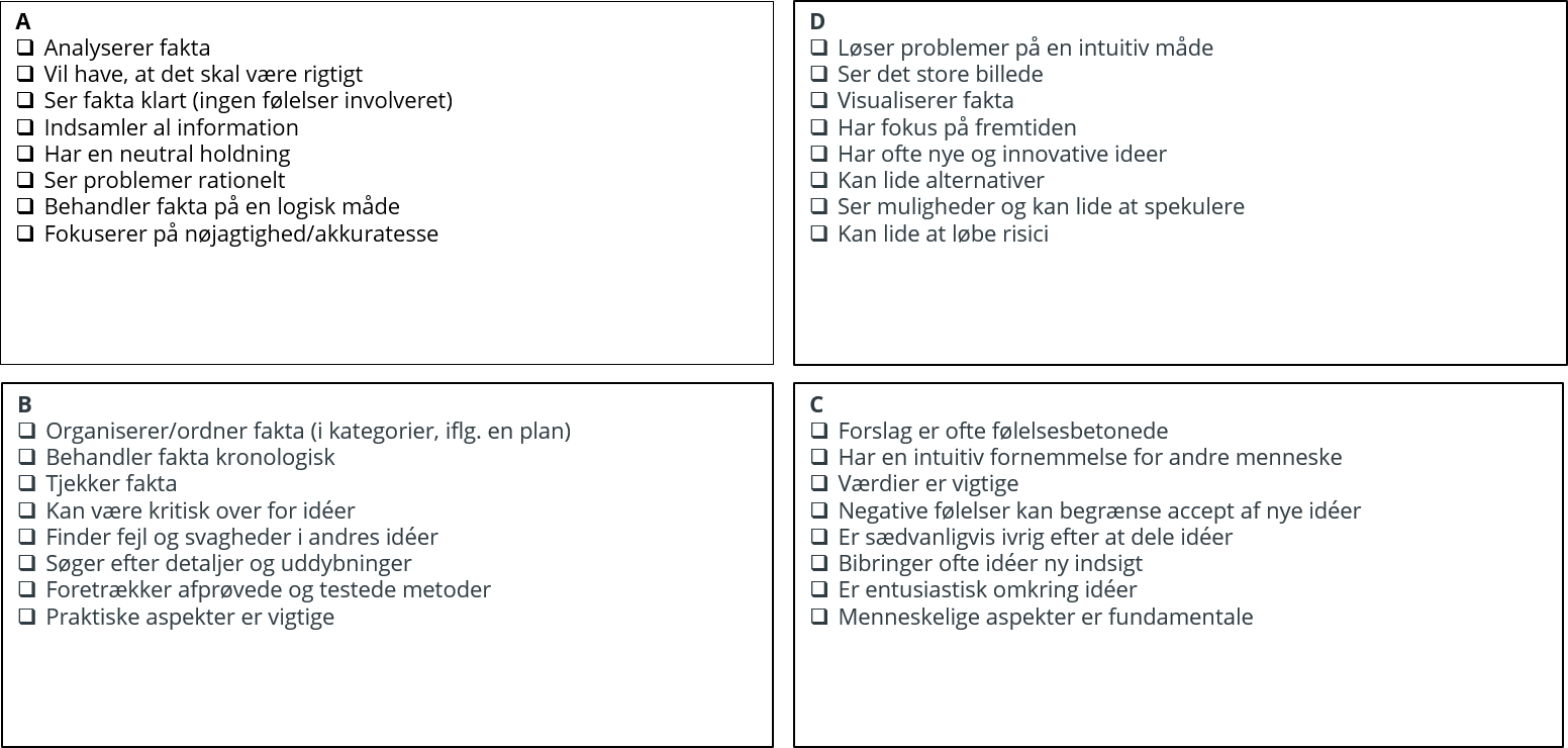 Nedenfor finder du tre præferenceindikerende kort, hvor du skal vælge de elementer, som du mener er vigtigst, og som du finder mest naturlige for dig, når du skal beskrive dine præferencer inden for kommunikation, problemløsning og læring.